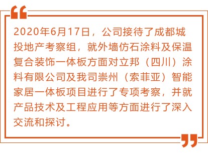 2020年6月17日,公司接待了成都城投地產(chǎn)考察組,就外墻仿石涂料及保溫復(fù)合裝飾一體板方面對(duì)立邦(四川)涂料有限公司及我司崇州(索菲亞)智能家居一體板項(xiàng)目進(jìn)行了專項(xiàng)考察,并就產(chǎn)品技術(shù)及工程應(yīng)用等方面進(jìn)行了深入交流和探討。